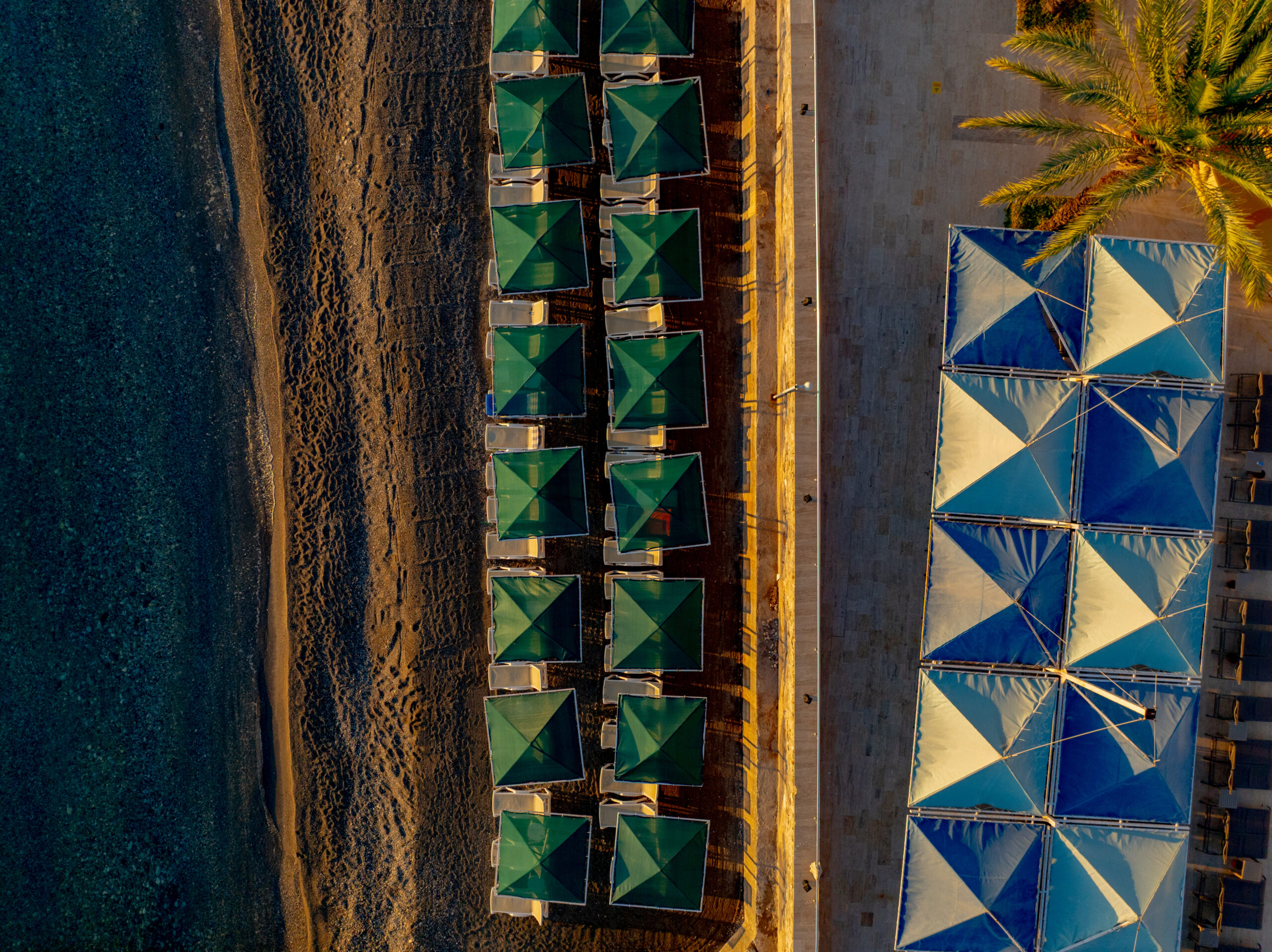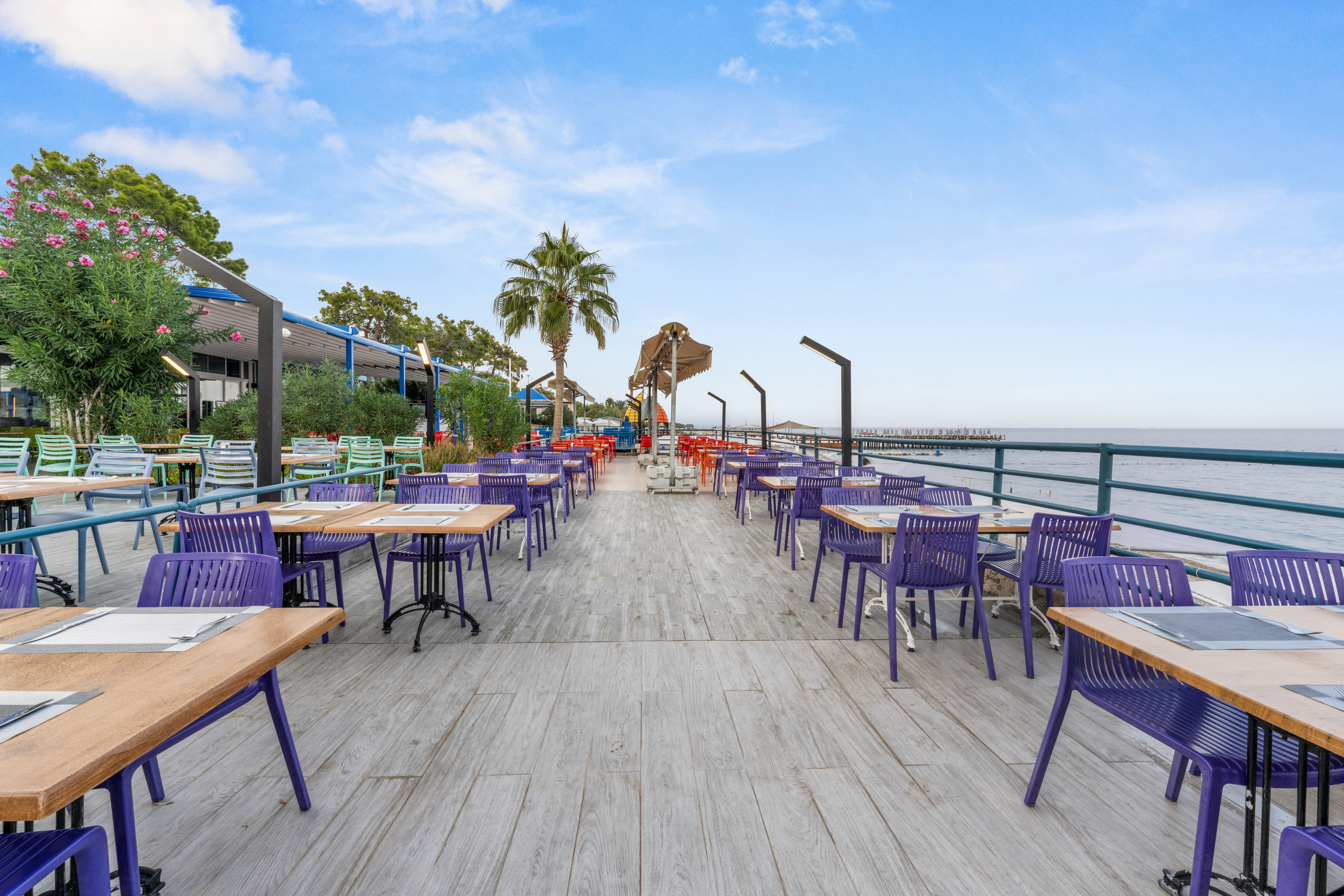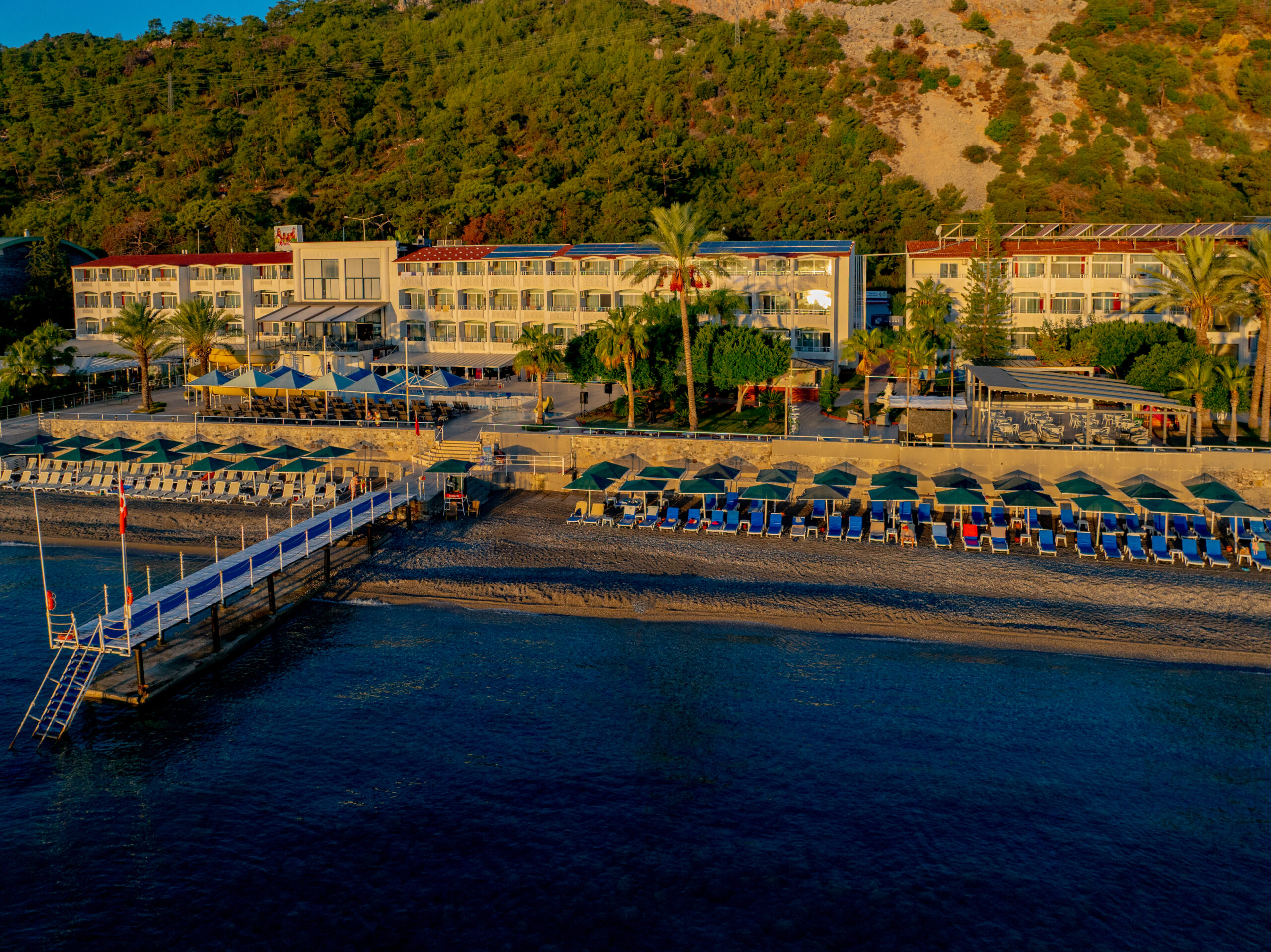 Özel plajda gün boyu Akdeniz enerjisi.